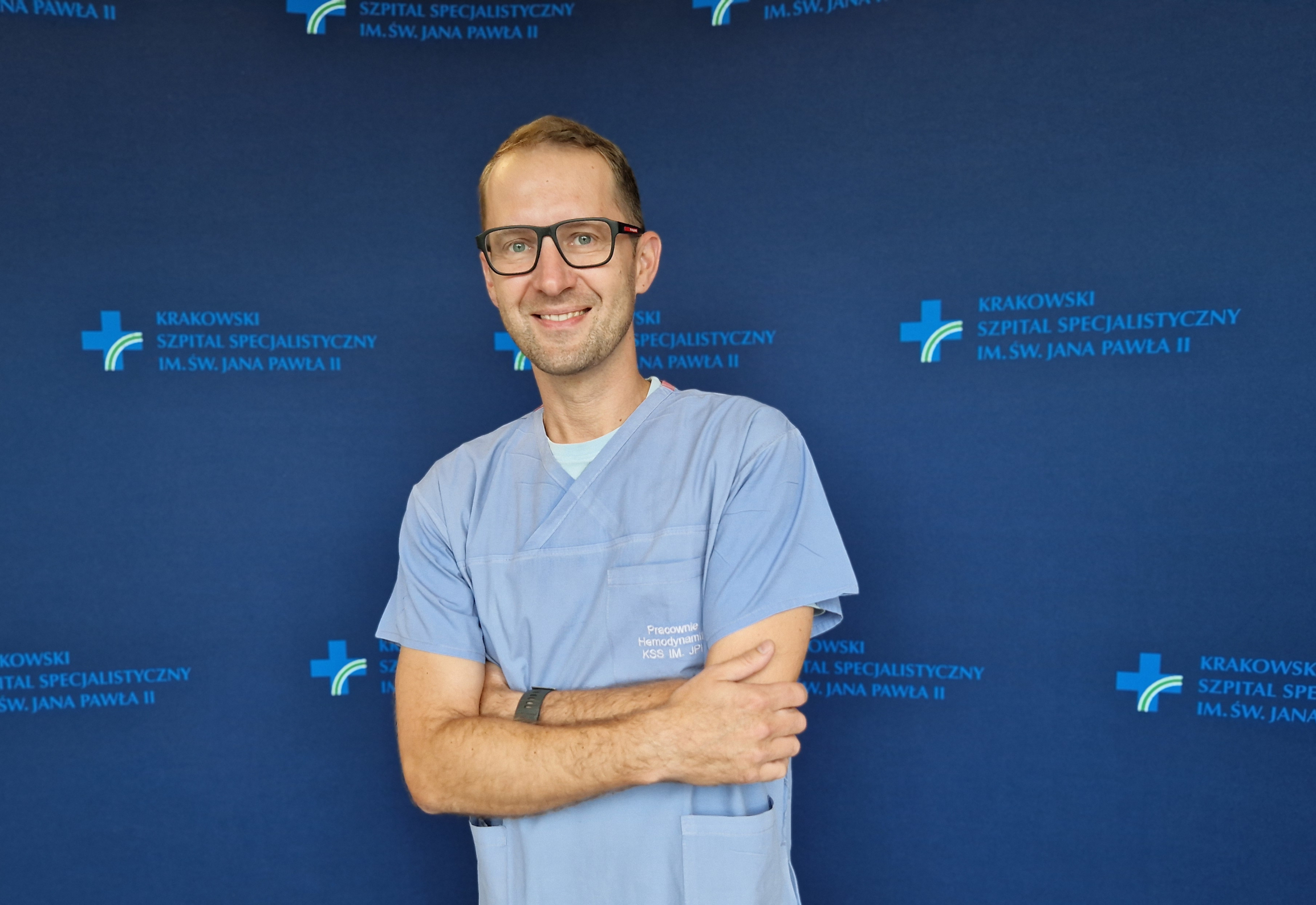 dr med. Mateusz Podolec w medycznym ubraniu na granatowej ścianie