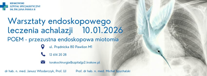 Warsztaty endoskopowego leczenia achlazji5 stycznia 2026/w Aktualności https://www.szpitaljp2.krakow.pl/wp-content/uploads/2026/01/Torakochirurgia-warsztaty.jpg 185 270 joanna https://www.szpitaljp2.krakow.pl/wp-content/uploads/2023/06/szpital-jp2.png joanna2026-01-05 15:02:512026-01-05 15:12:21Warsztaty endoskopowego leczenia achlazji